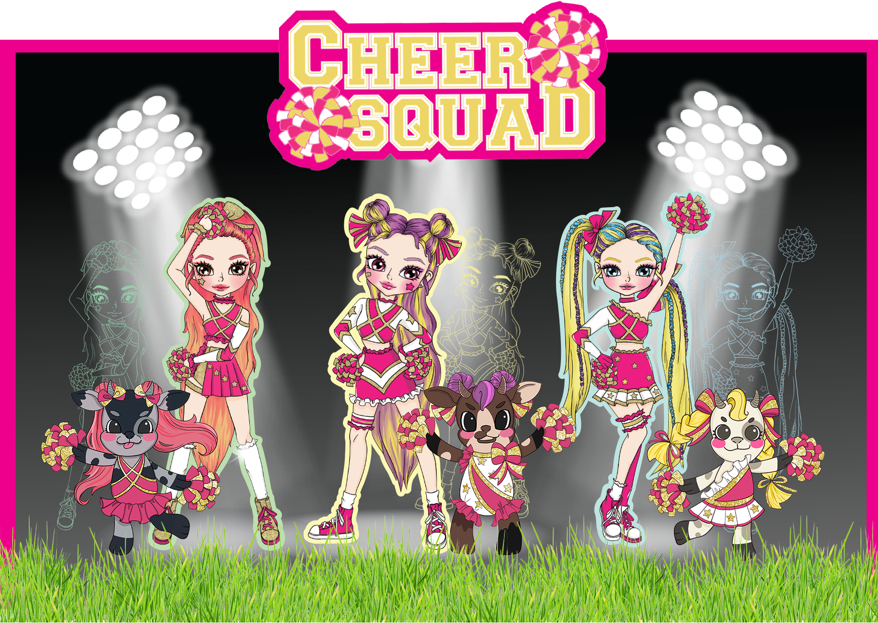 "CHEER SQUAD" is a fashion doll line targeted towards young girls ages 4-9, provides aspiration to little girls who want to be a CHEERLEADER! An adorable collaboration of Triplet Cheerleaders and Triplet Goat Mascots!